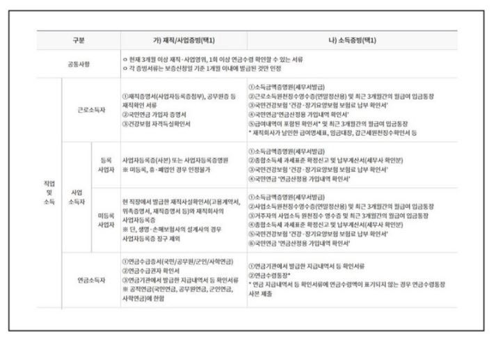 근로소득자 기준: 재직 증명서, 국민연금 가입자 증명서, 건강보험 자격득실 확인서