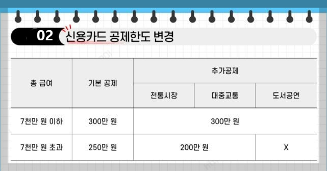 - 총 급여 7,000만 원 이하의 근로자가 신용, 직불, 선불카드, 현금 등 사용액이 25% 넘을 경우