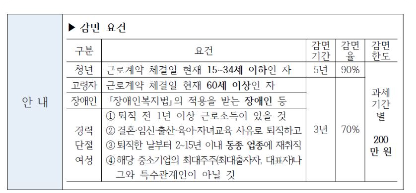 - 고령자 ~ 장애인·경력단절여성 소득세 감면율 70%(한도 200만 원)