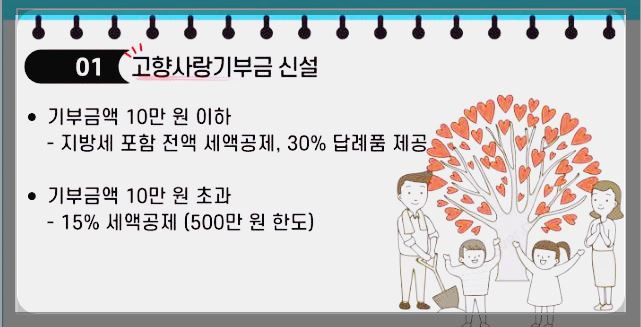 - 기부금이 10만 원 이하일 경우 지방세포함 전액 세액공제, 30% 답례품 제공