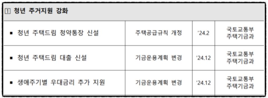 기존보다 더 많은 혜택을 제공하는 청년 주택 드림 청약통장을 출시하고, 주택도시기금 전세자금대출 상품 중 금리가 낮은 버팀목 전세자금 대출과 연계를 통해 연 1.5% 수준의 금리로 지원하며, 신혼부부전용 구입자금 대출이나 디딤돌 대출과도 연계해 자녀수에 따라 우대 금리를 적용받을 수 있도록 했습니다.
